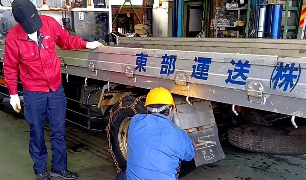 11月22日(土)、東部運送整備工場にて、入社後初めて冬季を迎える社員を対象とした「タイヤチェーン着脱講習会」を開催いたしました。